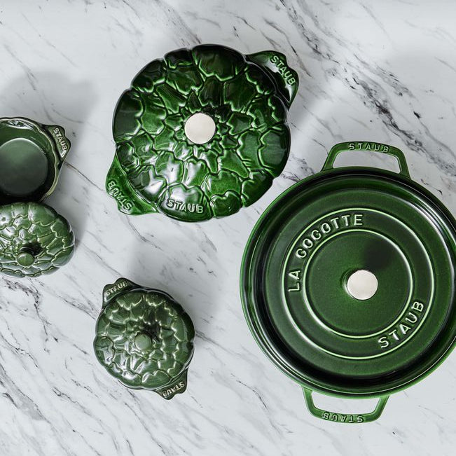 At Artichoke, we prefer Staub over other Enameled Cast Iron brands for several reasons. Staub's black enamel interior eliminates the need for seasoning, resists staining & spider-cracking, and is dishwasher-safe. This durable enamel ensures your cookware maintains its beauty and functionality over time. Additionally, Staub offers a lifetime warranty, underscoring their commitment to quality and longevity. Designed & Made in France, Staub pieces seamlessly transition from stovetop to oven to tabletop, combining performance with elegance.